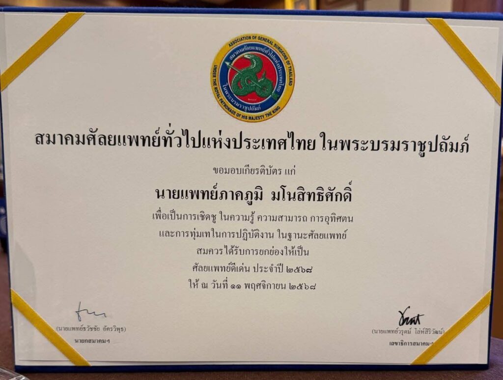เพื่อเชิดชูเกียรติในความประพฤติดี มีคุณธรรม จริยธรรม และการทำงานที่เป็นแบบอย่างแก่ศัลยแพทย์ทั่วประเทศ. ในโอกาสนี้ นายแพทย์ภาคภูมิ มโนสิทธิศักดิ์ ได้รับ โล่ประกาศเกียรติคุณและใบเกียรติบัตร “ศัลยแพทย์ดีเด่นประจำปี 2568”จากสมาคมศัลยแพทย์ทั่วไปแห่งประเทศไทย ในพระบรมราชูปถัมภ์ ที่ อาคารเฉลิมพระบารมี 50 ปี กรุงเทพมหานคร