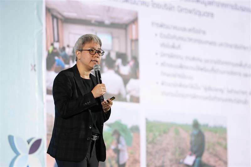 ในช่วงที่สอง นำเสนอหัวข้อ “เพิ่มผลผลิต ลดต้นทุน ด้วยเทคโนโลยีเกษตร” โดย รศ.ดร.ขวัญตรี แสงประชาธนารักษ์ จากมหาวิทยาลัยขอนแก่น ได้ชี้ให้เห็นเหตุผลสำคัญว่าเหตุใดเกษตรกรจำนวนมากยังไม่ใช้เทคโนโลยี โดยพบว่าเกษตรกรยังไม่เชื่อมั่นว่าการลงทุนคุ้มค่า แม้คุณภาพผลผลิตดีขึ้น แต่ราคาที่ได้รับไม่สะท้อนคุณภาพ ทำให้ขาดแรงจูงใจ อีกทั้งยังขาดบุคลากรด้านเทคโนโลยี เพราะแรงงานสูงวัยไม่กล้าลงทุน และคนรุ่นใหม่เข้าสู่อาชีพเกษตรน้อยลง อย่างไรก็ตาม เริ่มเห็นตัวอย่างเกษตรกรยุคใหม่ที่ประสบความสำเร็จ เช่น กลุ่มทำนาประณีตที่ชัยภูมิ และทายาทอ้อยร้อยล้านที่บุรีรัมย์ ที่หันมาใช้เทคโนโลยีและสร้างอาชีพใหม่ เช่น บริการโดรนพ่นยา และให้เช่าเครื่องจักรสมัยใหม่ ซึ่งช่วยลดต้นทุน เพิ่มผลผลิต และสร้างรายได้มั่นคง
