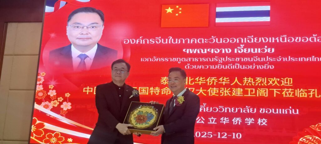 เมื่อเวลา 18.00 น.วันที่ 10 ธันวาคม 2568 ที่ หอประชุมโรงเรียนฮั่วเคี้ยววิทยาลัย เขตเทศบาลนครขอนแก่น สมาคม 24 องค์กรชาวไทยเชื้อสายจีนจังหวัดขอนแก่น ร่วมกับคณะกรรมการบริหารโรงเรียนฮั่วเคี้ยววิทยาลัย และชมรมโรงเรียนเอกชนสอนภาษาจีนภาคตะวันออกเฉียงเหนือ จัดงานเลี้ยงต้อนรับ ฯพณฯ จาง เจี้ยนเว่ย (H.E.Mr.Zhang Jianwei)เอกอัครราชทูตวิสามัญผู้มีอำนาจเต็มแห่งสาธารณรัฐประชาชนจีนประจำราชอาณาจักรไทย ในโอกาสเดินทางมาเยือนจังหวัดขอนแก่น โดยมี นายขจรเกียรติ รักพานิชมณี ผู้ว่าราชการจังหวัดขอนแก่น เป็นผู้กล่าวต้อนรับ พร้อมด้วยนายยุทธพร พิรุณสาร รองผู้ว่าราชการจังหวัดขอนแก่น ท่านหลิว หงเหม่ย กงสุลใหญ่แห่งสาธารณรัฐประชาชนจีน ประจำจังหวัดขอนแก่น ท่าน อู่ เจี้ยน อุปทูตสาธารณรัฐประชาชนจีน ประจำจังหวัดขอนแก่น นายนาวิน คำเวียง รองนายกองค์การบริหารส่วนจังหวัดขอนแก่น นายประสิทธิ์ ทองแท่งไทย นายกเทศมนตรีเทศบาลนครขอนแก่น นายธนากร อนันต์ภัทรชัย รักษาการประธานสภากรรมการโรงเรียนฮั่วเคี้ยววิทยาลัย นายวรากร โรจน์จรัสไพศาล ประธานชมรมโรงเรียนเอกชนสอนภาษาจีน ภาคตะวันออกเฉียงเหนือ ผู้นำ 24 องค์กรจีนจังหวัดขอนแก่น ประธานคณะกรรมการ และผู้บริหารสถานศึกษาของโรงเรียนเอกชนสอนภาษาจีน 19 แห่ง ในภาคตะวันออกเฉียงเหนือ ผู้นำองค์กร ข้าราชการ และบุคลากรทางการศึกษาเข้าร่วมงานอย่างคับคั่ง
