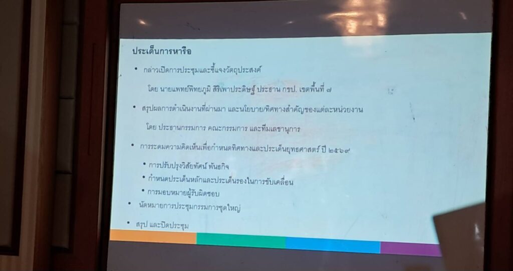 ในการประชุมได้มีการหารือเพื่อทำความเข้าใจแนวทางการดำเนินงานร่วมกัน ทบทวนบทบาทหน้าที่ของคณะกรรมการ กำหนดทิศทางการขับเคลื่อนนโยบาย รวมถึงการปรับปรุงวิสัยทัศน์และพันธกิจให้สอดคล้องกับบริบทพื้นที่ พร้อมทั้งสรุปผลการดำเนินงานที่ผ่านมา เพื่อนำเสนอในที่ประชุม กขป.7 และใช้เป็นข้อมูลประกอบการกำหนดแนวทางการทำงานในระยะต่อไป