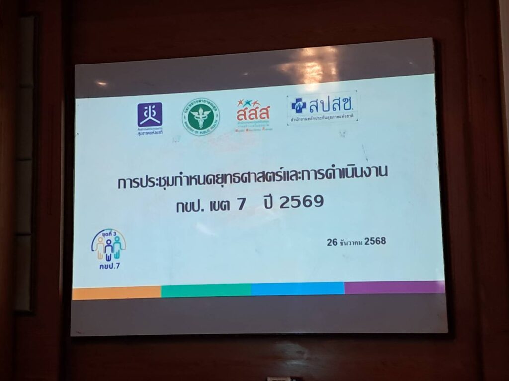 เมื่อวันที่ 26 ธันวาคม 2568 ที่ ห้องประชุมบิซิเนตร 6 โรงแรมเจริญธานี จังหวัดขอนแก่น นพ.พิทยภูมิ สิริเพาประดิษฐ์ ประธานคณะเขตสุขภาพเพื่อประชาชน เขตที่ 7 เป็นประธานการประชุมกองเลขานุการฯ ร่วมกับคณะกรรมการและหน่วยงานภาคีที่เกี่ยวข้อง อาทิ สำนักงานคณะกรรมการสุขภาพแห่งชาติ (สช.) สำนักงานหลักประกันสุขภาพแห่งชาติ (สปสช.) สำนักงานกองทุนสนับสนุนการสร้างเสริมสุขภาพ (สสส.) และกระทรวงสาธารณสุข (สธ.) เพื่อเตรียมการจัดเวทีประชุมคณะเขตสุขภาพเพื่อประชาชน เขตที่ 7 (กขป.7) ชุดที่ 3 ครั้งที่ 1/2569 ซึ่งคาดว่าจะจัดขึ้นในช่วงต้นเดือนกุมภาพันธ์ 2569