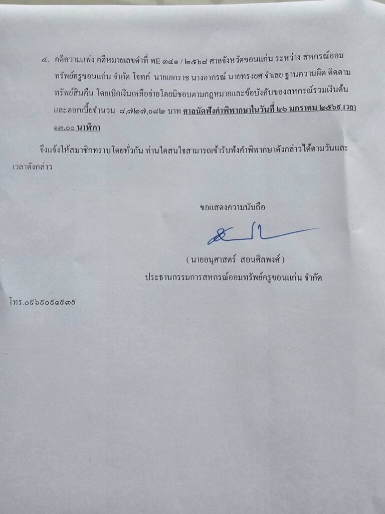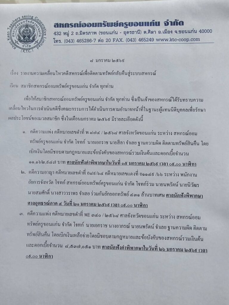 เพื่อให้สมาชิกสหกรณ์ออมทรัพย์ครูขอนแก่น จำกัด ทุกท่าน ซึ่งเป็นเจ้าของสหกรณ์ได้รับทราบความเคลื่อนไหวในการดำเนินคดี ซึ่งคณะกรรมการได้ดำเนินการตามอำนาจหน้าที่ในฐานะผู้แทนนิธิบุคคล เพื่อผลประโยชน์ของมวลสมาชิก ซึ่งในเดือนมกราคม 2569 มีรายละเอียดดังนี้