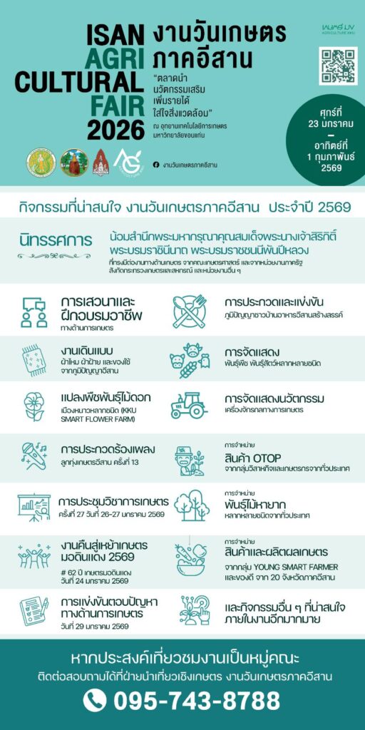 นอกจากนี้ ยังมีกิจกรรมประกวดและสร้างสีสัน เช่น การประกวดร้องเพลงลูกทุ่งเกษตรอีสาน การประกวดมินิวงดนตรีลูกทุ่ง (ครั้งที่ 1 ) การประกวดวงดนตรีสตริง Aggie Music Award 2026  การประกวด Cover Dance การแข่งขันตอบปัญหาทางการเกษตร งานเดินแบบผ้าไหม ผ้าฝ้ายจากภูมิปัญญาอีสาน การประชุมวิชาการเกษตร ครั้งที่ 27 งานคืนสู่เหย้าเกษตร มอดินแดง รวมถึงโซนจำหน่ายพันธุ์ไม้หายาก สินค้า OTOP และผลิตภัณฑ์เกษตรจากทั่วประเทศ ปักหมุดวันที่ 23 มกราคม ถึง 1 กุมภาพันธ์ 2569 ณ อุทยานเทคโนโลยีการเกษตร มหาวิทยาลัยขอนแก่น ติดตามและสอบถามรายละเอียดเพิ่มเติมได้ที่ Facebook : งานวันเกษตรภาคอีสาน https://www.facebook.com/aggiekkufair.
