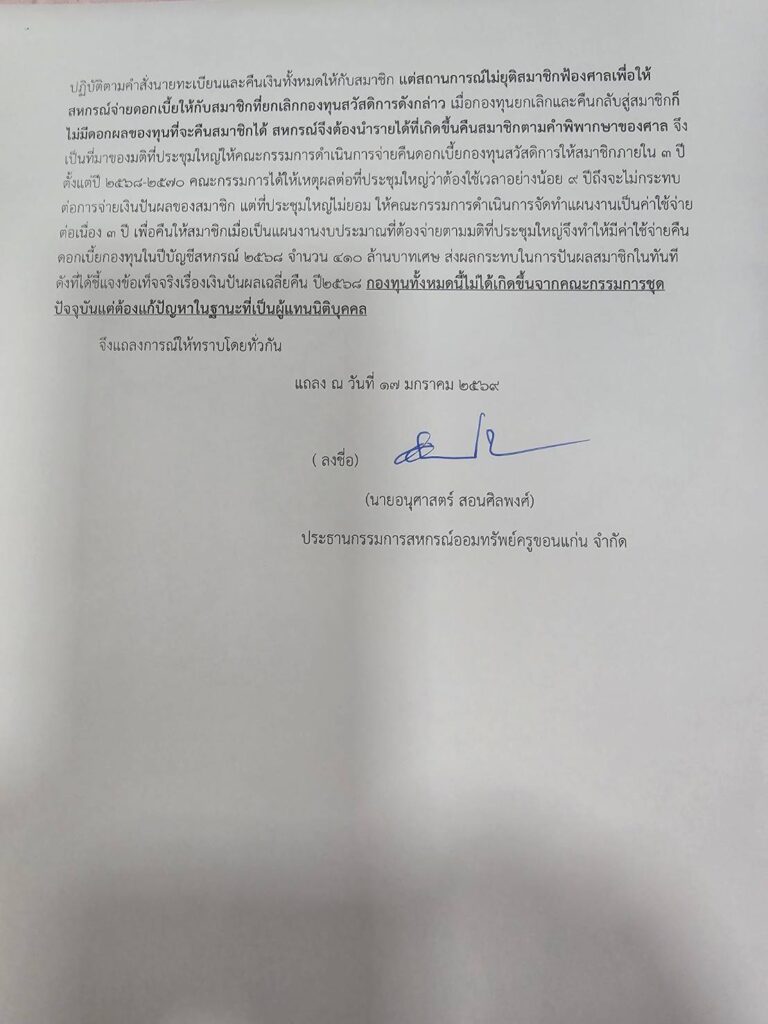 ดอกเบี้ยกองทุนในปีบัญชีสหกรณ์ 2568 จำนวน 410 ล้านบาทเศษ ส่งผลกระทบในการปันผลสมาชิกในทันที ดังที่ได้ขี้แจงข้อเท็จจริงเรื่องเงินปันผลเฉลี่ยคืน ปี2568 กองทุนทั้งหมดนี้ไม่ได้เกิดขึ้นจากคณะกรรมการชุดปัจจุบัน แต่ต้องแก้ปัญหาในฐานะที่เป็นผู้แทนนิติบุคคล