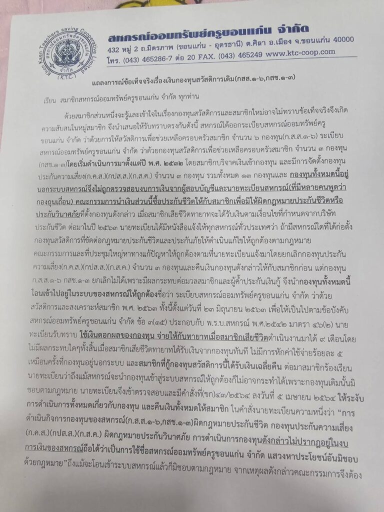 ปธ.สหกรณ์ครูฯขอนแก่น แถลงการณ์ข้อเท็จจริงเรื่องเงินกองทุนสวัสดิการเดิม(ก.ส.ส.1-6,กสช.1-3)