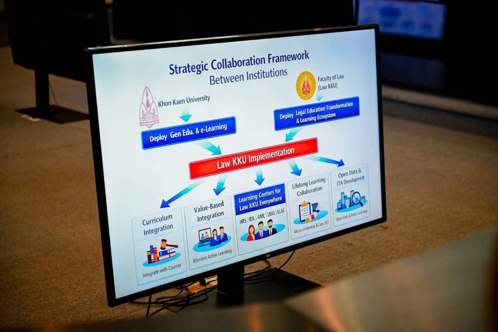 ยุทธศาสตร์ที่ 2 การพัฒนาระบบการเรียนรู้ตลอดชีวิต ผ่านการจัดตั้งศูนย์การเรียนรู้ภายใต้ยุทธศาสตร์ “Law KKU Everywhere” จำนวน 5 ศูนย์หลัก ครอบคลุมด้านสิทธิมนุษยชน กฎหมายเศรษฐกิจ การมีส่วนร่วมของประชาชน งานวิจัยเชิงนโยบาย และการให้บริการประชาชนด้านกฎหมาย พร้อมทั้งพัฒนาหลักสูตร Micro-Credential สำหรับผู้ประกอบวิชาชีพกฎหมาย เพื่อยกระดับมาตรฐานจริยธรรมและการปฏิบัติงานอย่างโปร่งใส