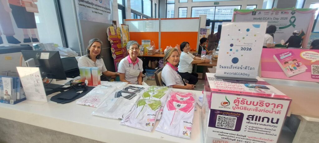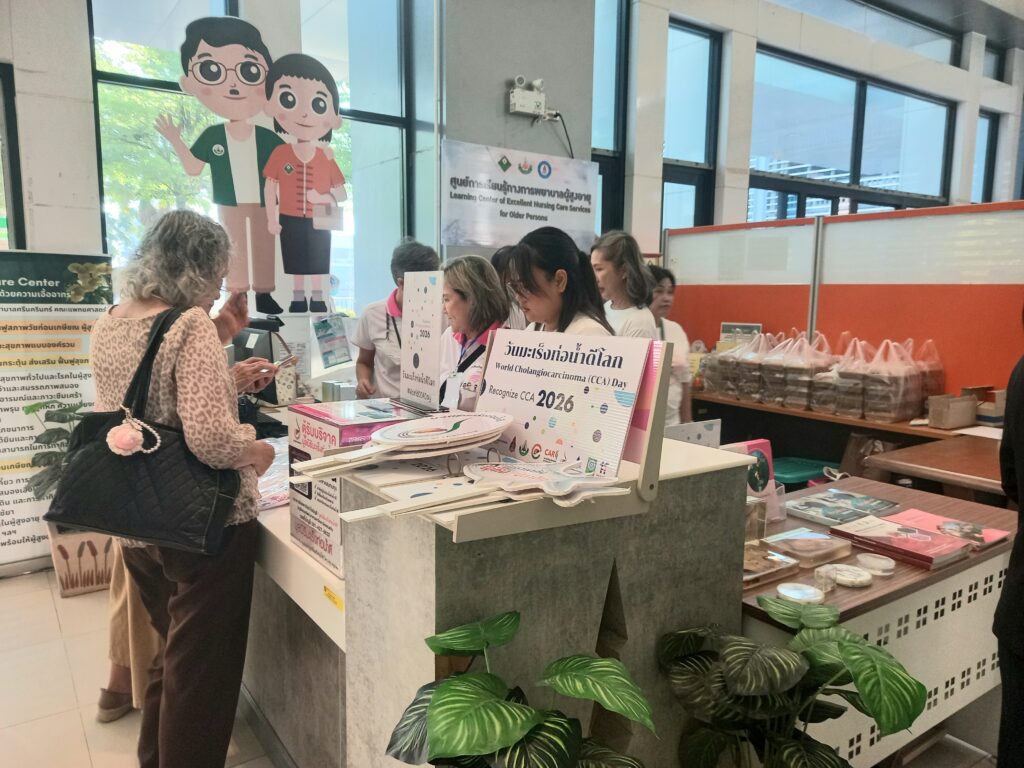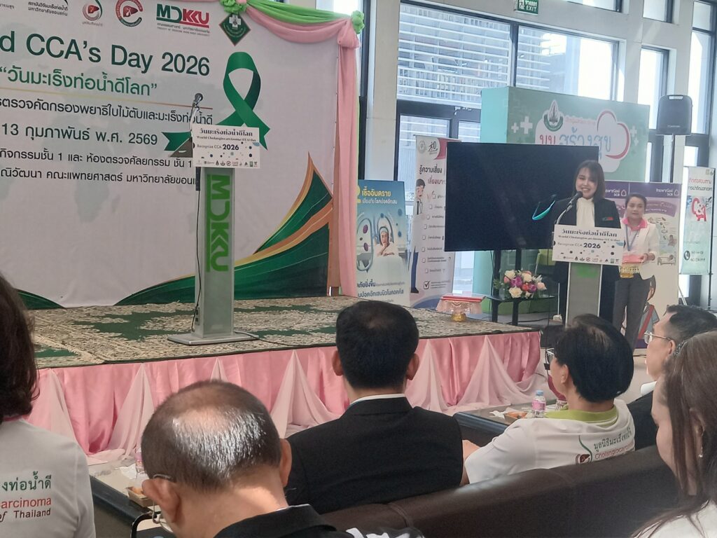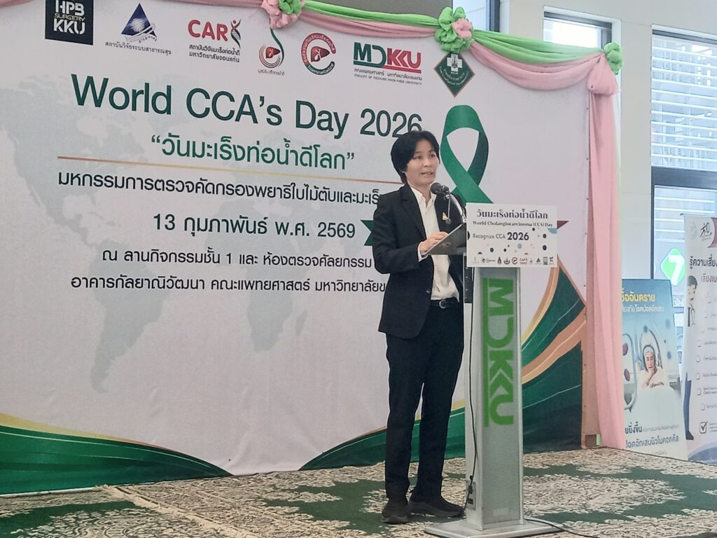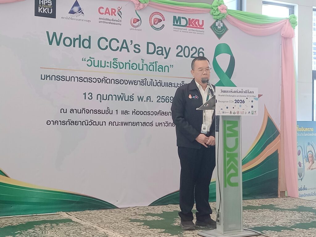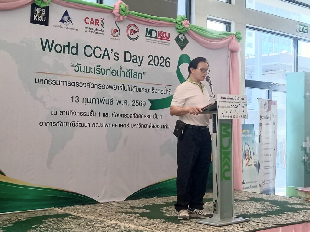 เมื่อเวลา 09.00 น. วันที่ 13 กุมภาพันธ์ 2569 ที่ลานกิจกรรมชั้น 1 และห้องตรวจศัลยกรรม ชั้น 1 อาคารกัลยาณิวัฒนา คณะแพทยศาสตร์ มหาวิทยาลัยขอนแก่น ศ.ดร.ธิดารัตน์ บุญมาศ รองอธิการบดีฝ่ายวิสาหกิจและสังคมยั่งยืน มหาวิทยาลัยขอนแก่น เป็นประธานเปิดกิจกรรม “วันมะเร็งท่อน้ำดีโลก World CCA’s Day 2026” โดยมี ศ.นพ.สมศักดิ์ เทียมเก่า ผู้อำนวยการโรงพยาบาลศรีนครินทร์ ,นพ.เรืองศิลป์ เถื่อนนาดี ประธานมูลนิธิมะเร็งท่อน้ำดี ,อาจารย์ นพ.ธนชัย แสนลัง สาขาวิชาอายุรศาสตร์ คณะแพทยศาสตร์ มหาวิทยาลัยขอนแก่น ,นายสมิทธิ์ ซื่อตรง อดีตผู้ป่วยมะเร็งท่อน้ำดี ,พว.สุพัฒตรา ศรีภักดี พยาบาลวิชาชีพขั้นสูงมะเร็งพ่อน้ำดี โรงพยาบาลศรีนครินทร์ ,นางนันทกา ขันตีแก้ว ภรรยา ศ.นพ. ณรงค์ ขันตีแก้ว อดีตผู้อำนวยการสถาบันวิจัยมะเร็งท่อน้ำดี มข. เจ้าหน้าที่ พร้อมทั้งประชาชน ร่วมงานวันมะเร็งท่อน้ำดีโลก World CCA’s Day 2026″ภายใต้โครงการวิจัยเชิงปฏิบัติการเพื่อแก้ไขปัญหาพยาธิใบไม้ตับและมะเร็งท่อน้ำดีในเขตสุขภาพ 7, 8, 9 และ 10การจัดงานครั้งนี้เกิดจากความร่วมมือระหว่าง สถาบันวิจัยระบบสาธารณสุข (สวรส.), สถาบันวิจัยมะเร็งท่อน้ำดี, มูลนิธิมะเร็งท่อน้ำดี และศูนย์ความเป็นเลิศทางการแพทย์มะเร็งท่อน้ำดี โรงพยาบาลศรีนครินทร์ คณะแพทยศาสตร์ มข. โดยมีผู้บริหาร คณาจารย์ บุคลากรทางการแพทย์ อดีตผู้ป่วย และประชาชนเข้าร่วมอย่างคับคั่งกว่า 250 คน