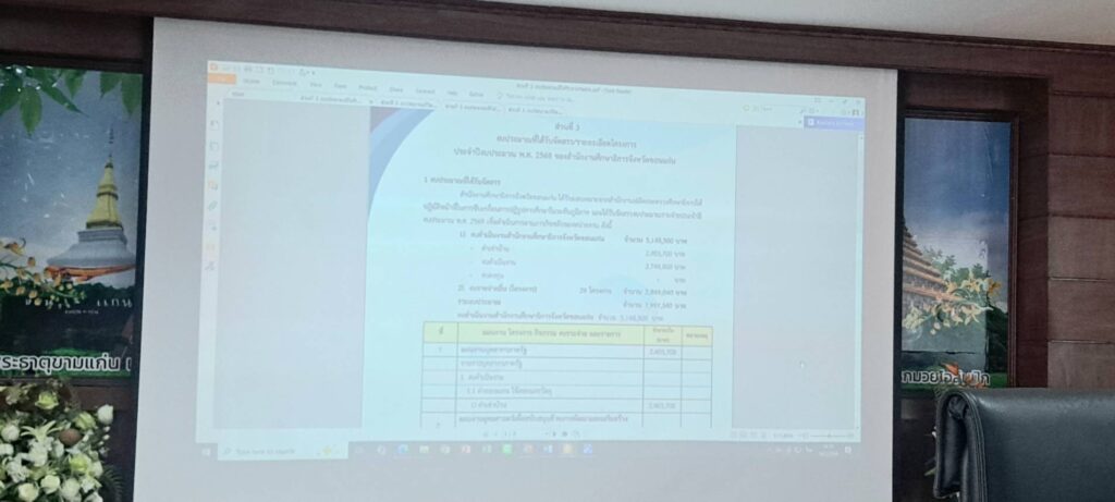 ในช่วงภาคเช้า คณะกรรมการได้ลงพื้นที่รับฟังการชี้แจงแผนการใช้จ่ายงบประมาณประจำปีงบประมาณ พ.ศ.2568 ของสำนักงานเขตพื้นที่การศึกษามัธยมศึกษาขอนแก่น ซึ่งได้รับการจัดสรรงบประมาณวงเงินรวม 5 ล้านบาท แบ่งการใช้งบออกเป็น 4 ไตรมาส ไตรมาสละ 1,250,000 บาท โดยมี ดร.ทวีศักดิ์ สมนอก และนายโกสินทร์ บุญมาก รองผู้อำนวยการสำนักงานเขตพื้นที่การศึกษามัธยมศึกษาขอนแก่น พร้อมด้วยผู้อำนวยการกลุ่มต่าง ๆ ร่วมให้การต้อนรับและชี้แจงรายละเอียดแผนปฏิบัติการ