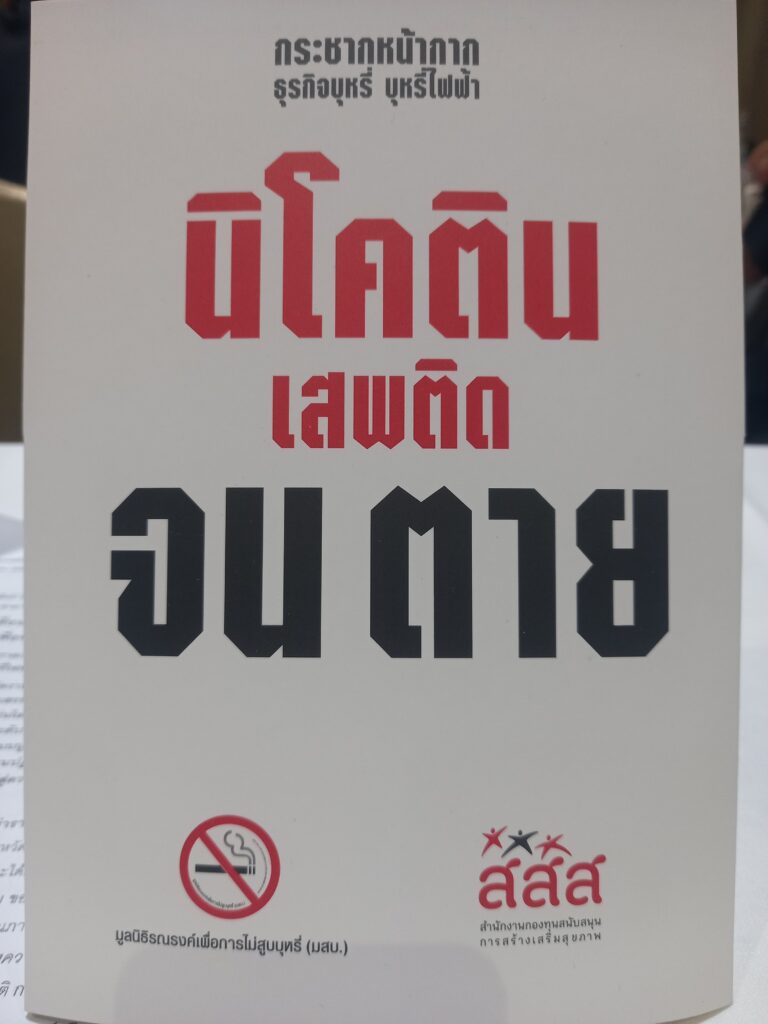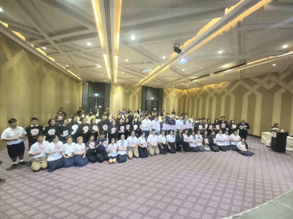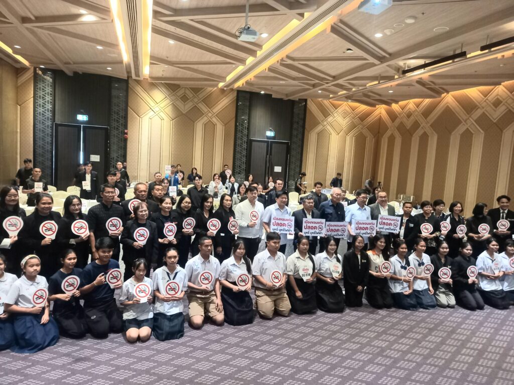 การแถลงข่าวครั้งนี้จัดโดย มูลนิธิรณรงค์เพื่อการไม่สูบบุหรี่ จุดจัดการเพื่อโรงเรียนปลอดบุหรี่