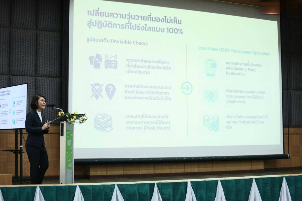 ศ.ดร.กาญจนา เศรษฐนันท์ หัวหน้าโครงการวิจัยฯ อธิบายว่า i-Move ถูกพัฒนาขึ้นเพื่อแก้ปัญหาระบบเดิมที่ขาดการติดตามแบบเรียลไทม์และข้อมูลเชิงลึก ส่งผลให้เกิดความล่าช้าและต้นทุนแฝง โดยระบบใหม่นี้เชื่อมโยงเทคโนโลยี IoT ฐานข้อมูล และระบบดิจิทัลเข้าด้วยกัน ทำให้สามารถบริหารจัดการได้อย่างมีประสิทธิภาพ